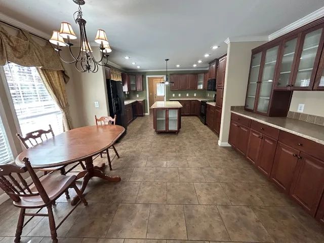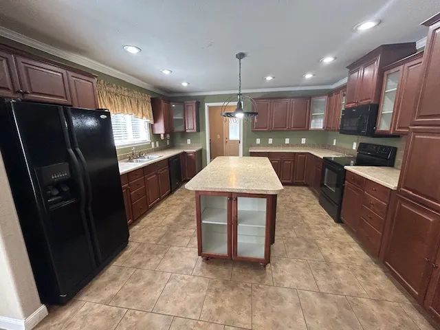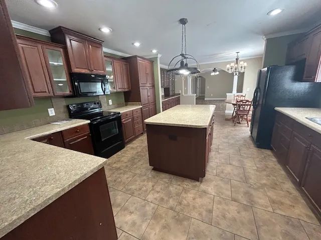 The home features approximately 2,176 square feet of living area with 3 bedrooms and 2 full baths. Inside, you’ll find a spacious kitchen with abundant cabinetry, a center island, and an open kitchen/dining floor plan—perfect for everyday living and entertaining. The large den includes a cozy gas log fireplace, creating a warm and inviting atmosphere.